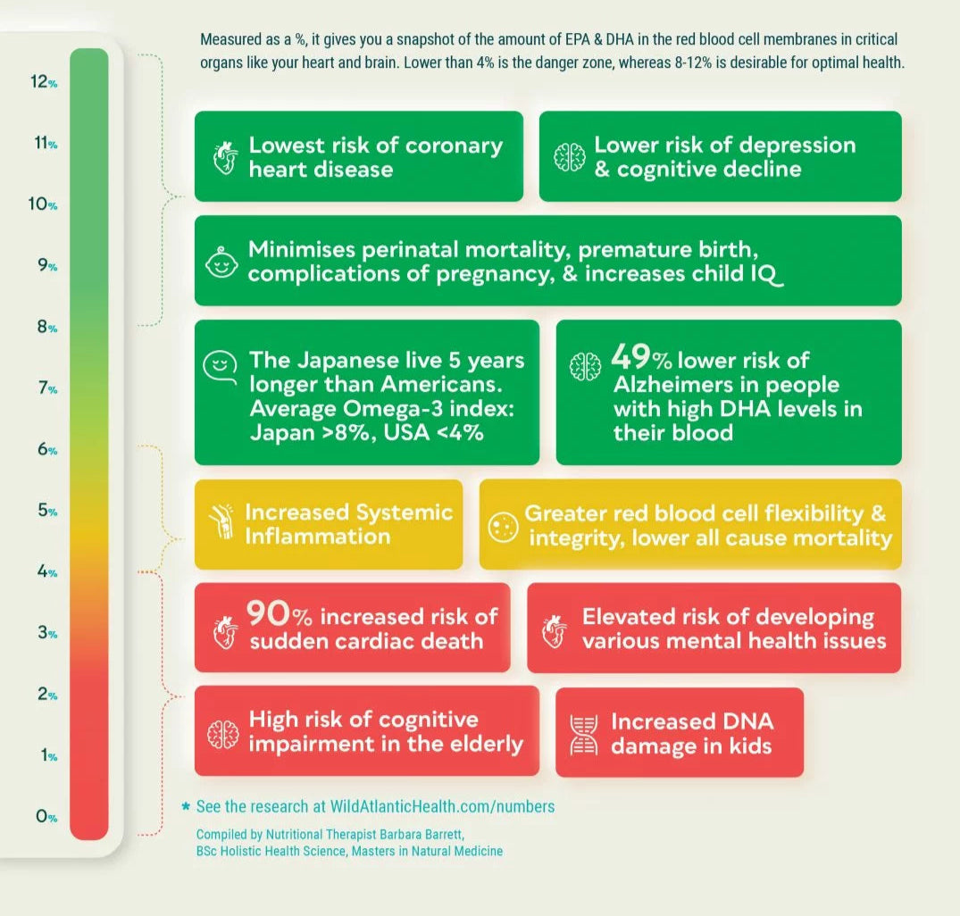 Optimal Omega-3 Index: 8-12% – Considered ideal for heart, brain, and overall health.